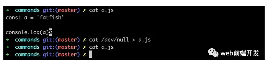 ➜ commands git:(master) ✗ cat a.js // The content in a.js is cleared.
